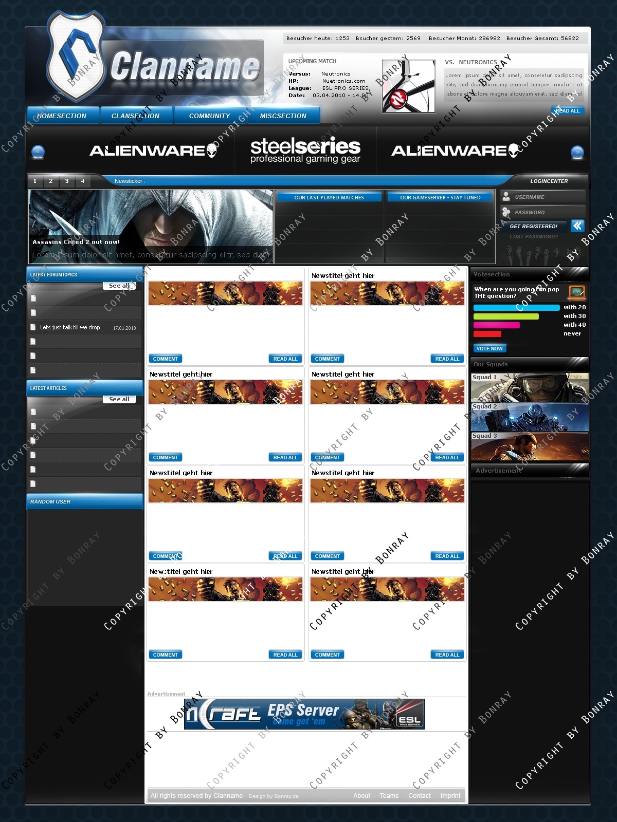 ich biete hier ein frisches, hochwertiges Clandesign in modernen Farben an. Das Design lässt sich einfach slicen und aufgrund des simplen Aufbaus leicht an gängige CMS Systeme wie Webspell und DZCP anpassen. Das Design lässt sich eigenhändig mit allen gängigen Photoshop Version bearbeiten.