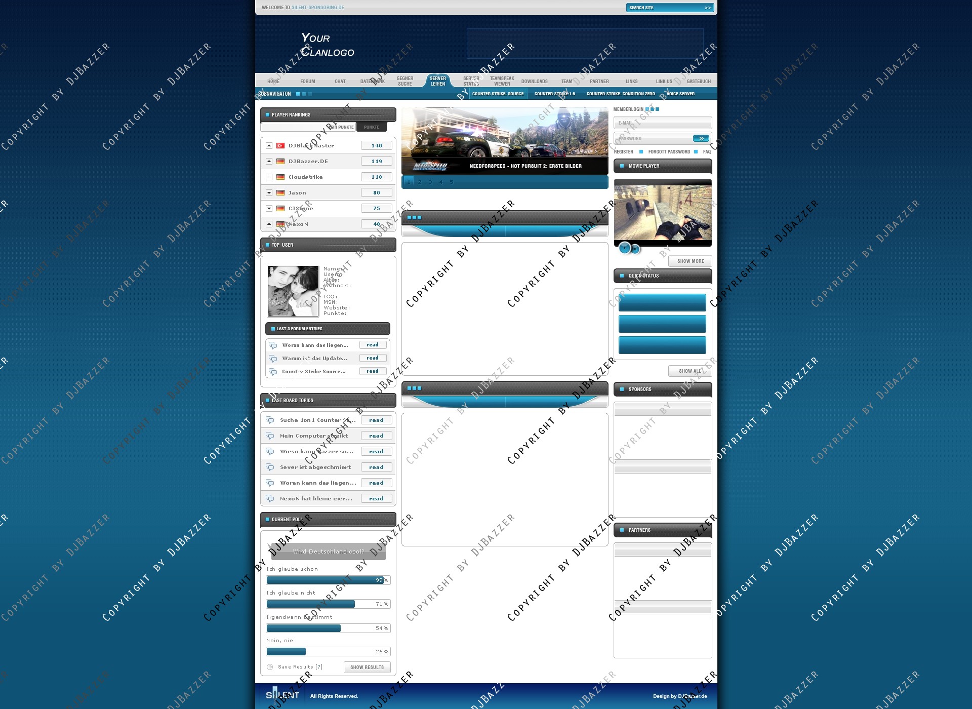 Sie kaufen hier eins meiner Clandesigns. Das Design wurde z.B schon einmal benutz als Sponsoring seite, deswegen habe ich die Navigation auch noch nicht geändert, dies passe ich Ihnen aber sehr gerne noch an.