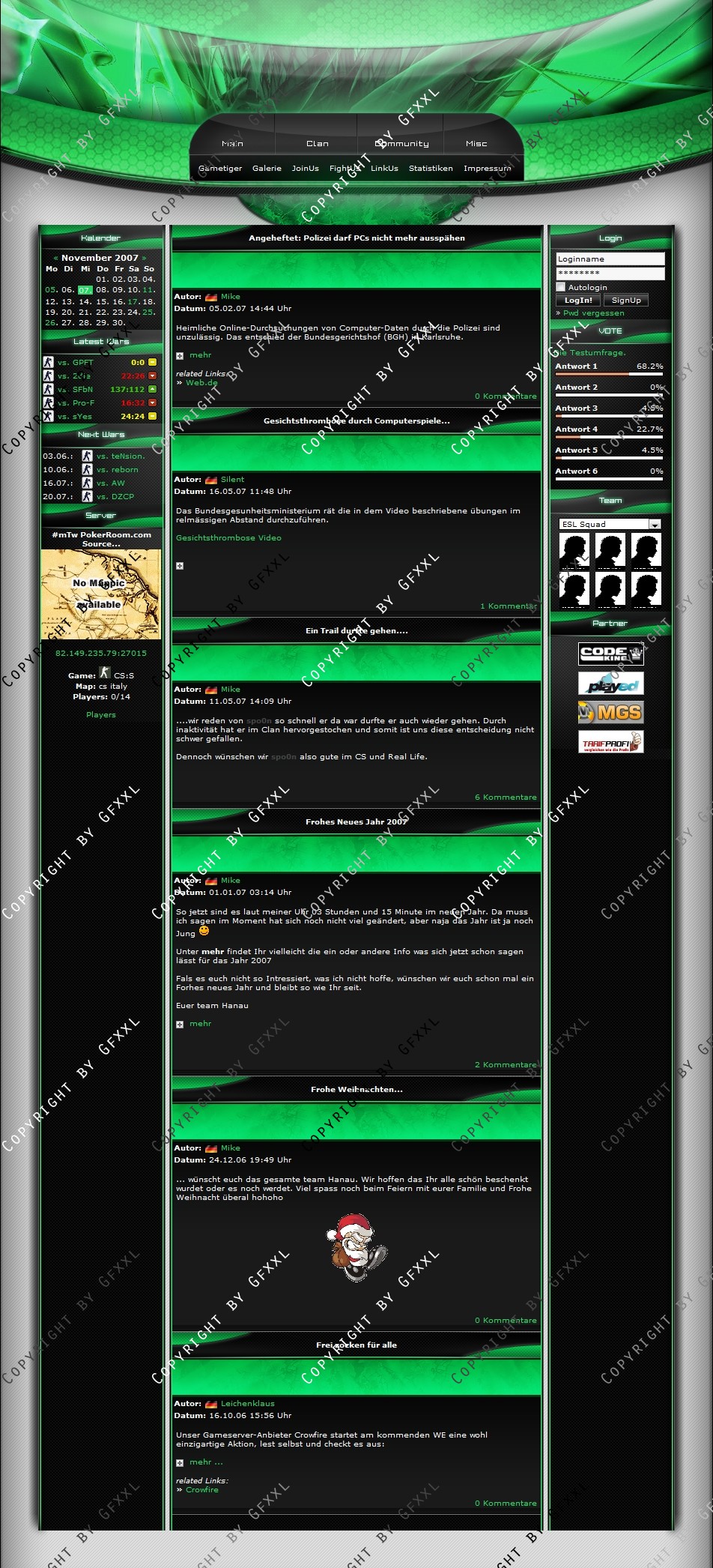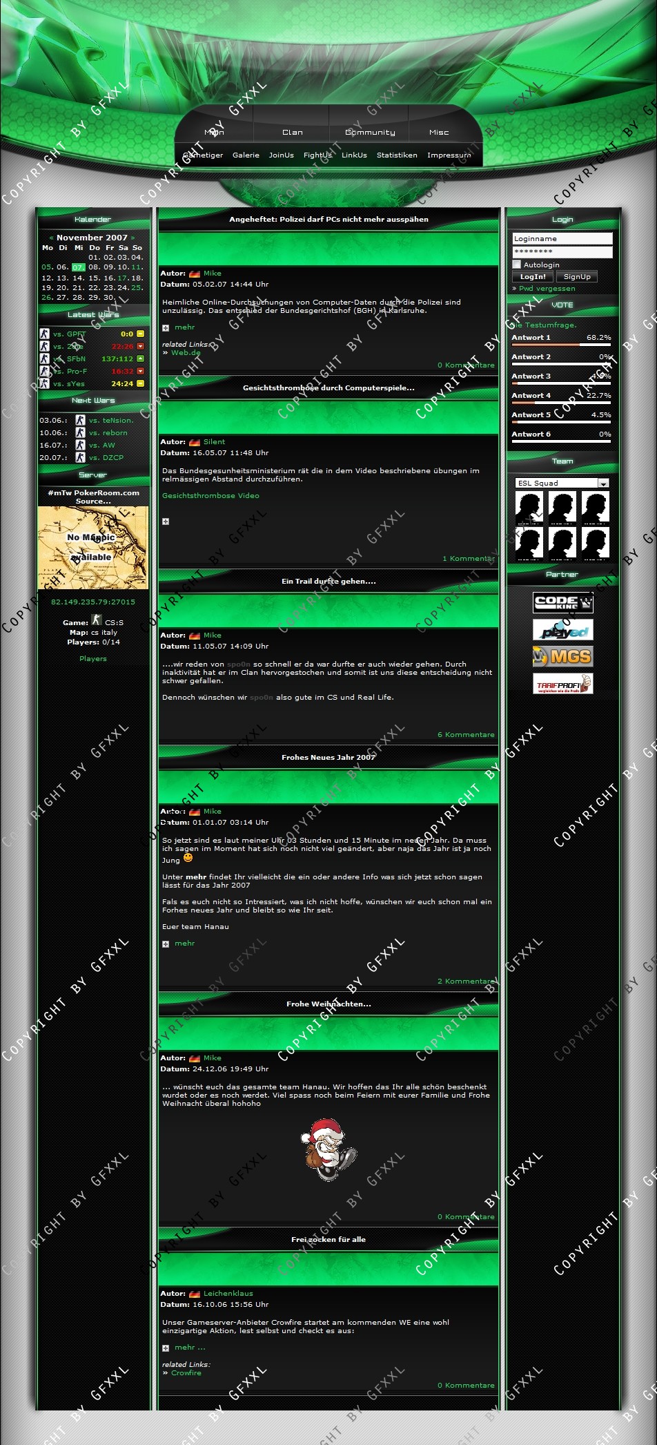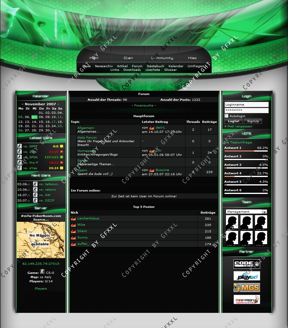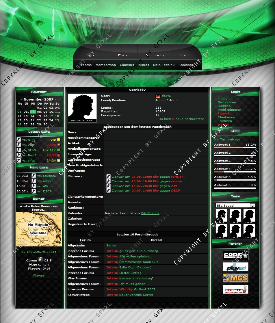 Wir sind mit unserem Templete von ClanDesigns.org und CodeKing.eu voll und ganz zufrieden. Alle unsere Änderungswünsche sind sehr gut gelungen und die Installation war ein Kinderspiel. Der Support ist genial schnell, freundlich und echt nicht aus der Ruhe zu bringen :-) Super schnelle und gute Lösung für jeden Clan der sich von der Masse abheben will.
