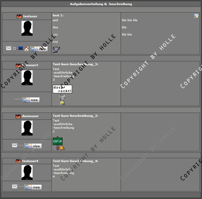 Nachdem mich meine Member mehrmals darauf angesprochen haben, wo & wie man denn einen Admin oder Zuständigen für einen bestimmten Bereich im Clan erreichen kann, bin ich auf die Idee gekommen, diese Übersicht dazu zu coden.