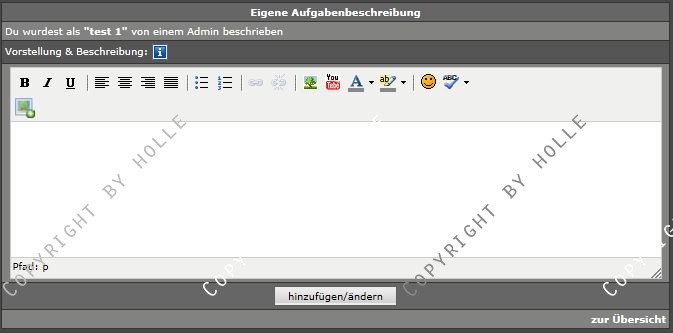 User, die in der Aufgabenverwaltung gelistet sind, können einen eigenen Text definieren und sich so zB Vorstellen oder eine eigene Stellenbeschreibung hinzufügen.
