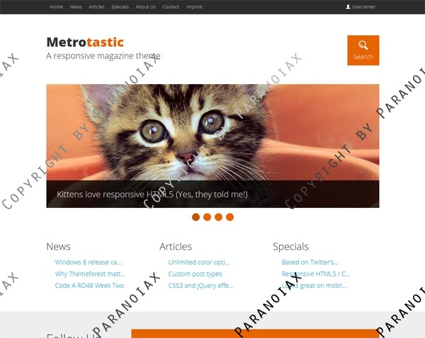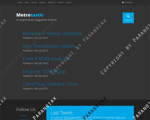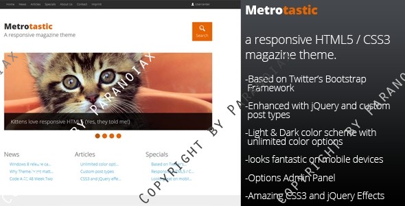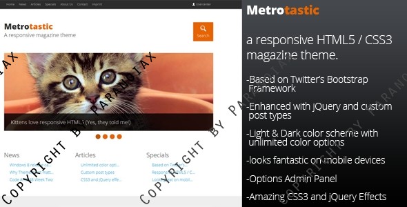 Metrotastic is a responsive HTML5 / CSS3 Theme for WordPress. It is based on Twitter’s Bootstrap Framework – Enhanced with jQuery and custom post types. It’s designed with online magazines in mind and comes with a light and dark color scheme and unlimited color options. It looks fantastic on mobile devices, is easy to setup and has some amazing CSS3 and jQuery effects. Everything right out of the box. So what are you waiting for?