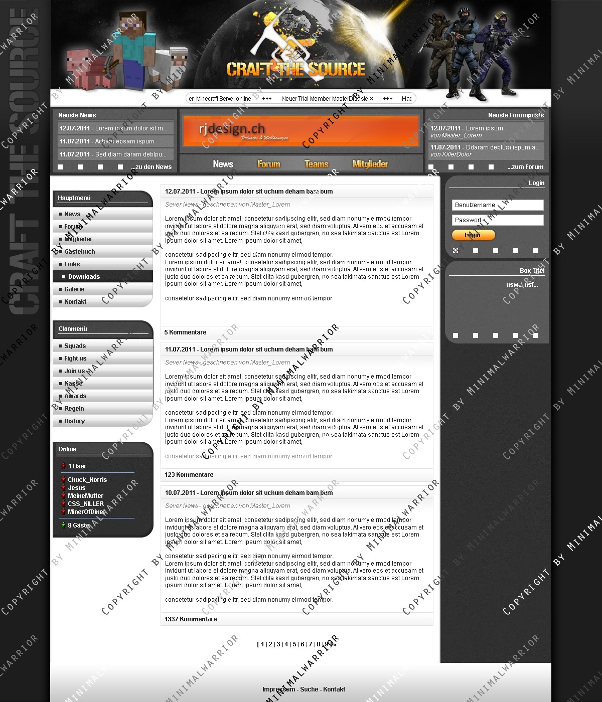 Ich verkaufe folgendes Clan Layout mehrmals oder exklusiv zu einem für mich angemessenen Preis-/Leistungsverhältnis! Verkauft wird lediglich das Design welches an Ilch angepasst ist und die .psd-Dateien des jeweiligen Templates, das bedeutet also, dass der Name Craft the Source vom Logo und den kompletten Grafiken bzw. Slicing im Preis inbegriffen ist.